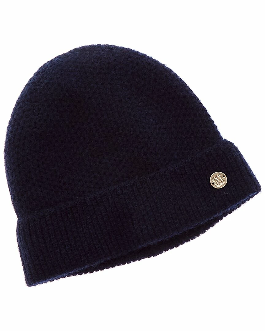 - Honeycomb Stitched Cuffed Cashmere Hat in navy with round logo accent