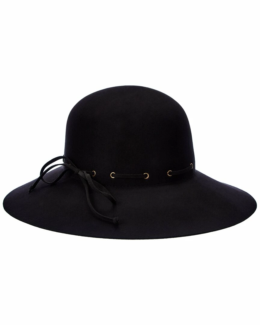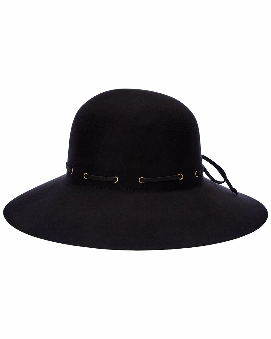 - Leather-Trim Wool Felt Hat in black with gold-tone grommets and self-tie bow