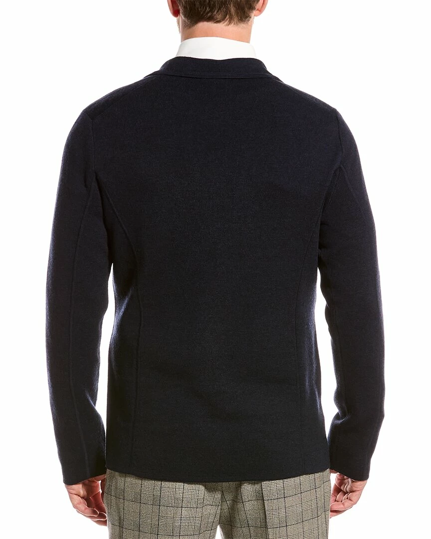 - Merino Wool Cardigan in navy with notch lapel and two front pockets