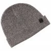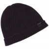- Plaited Ribbed Cashmere Beanie in black with ribbed design and rolled cuff with patch logo