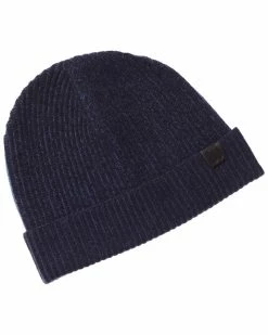 - Plaited Ribbed Cashmere Beanie in navy with ribbed design and rolled cuff with patch logo