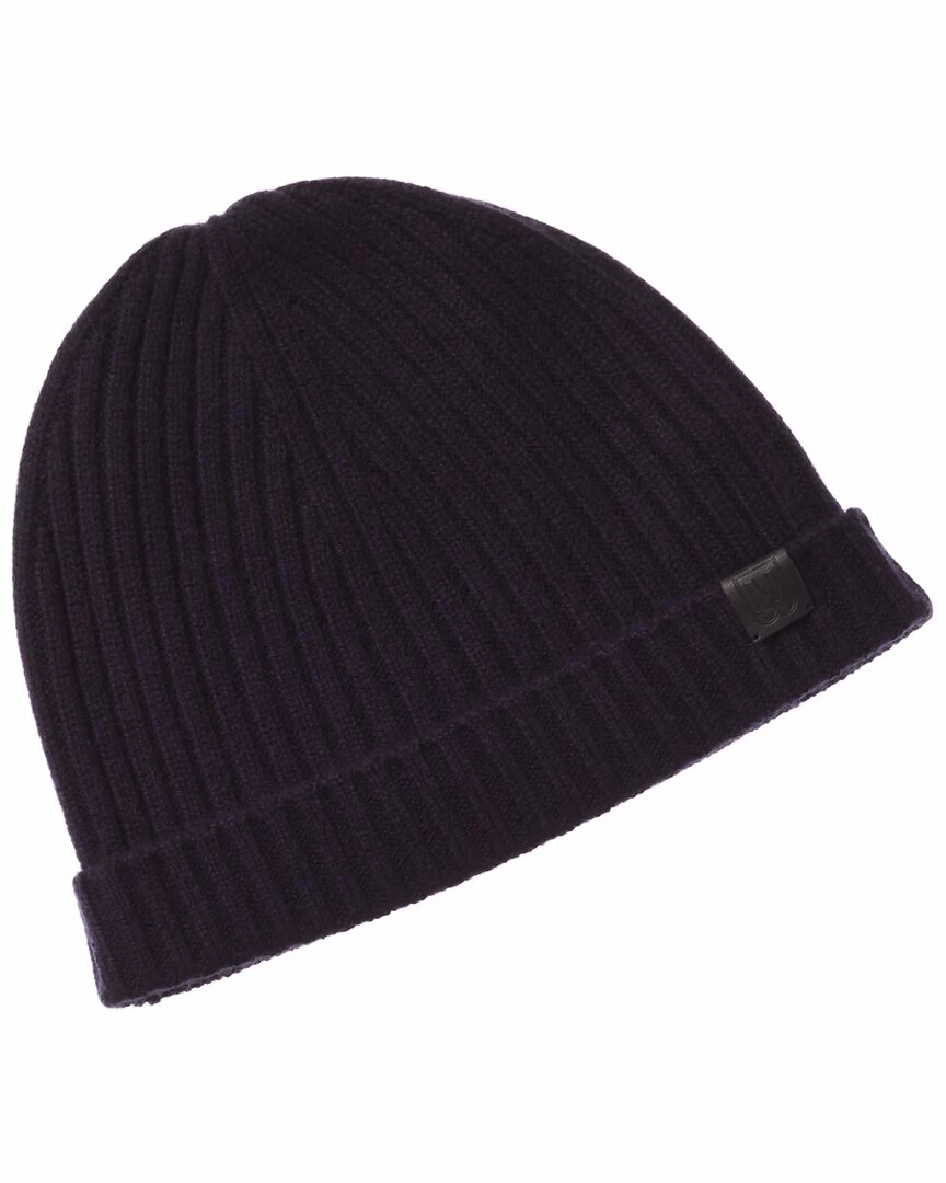 - Short Cuff Rib Cashmere Hat in navy with ribbed design and rolled cuff with patch logo